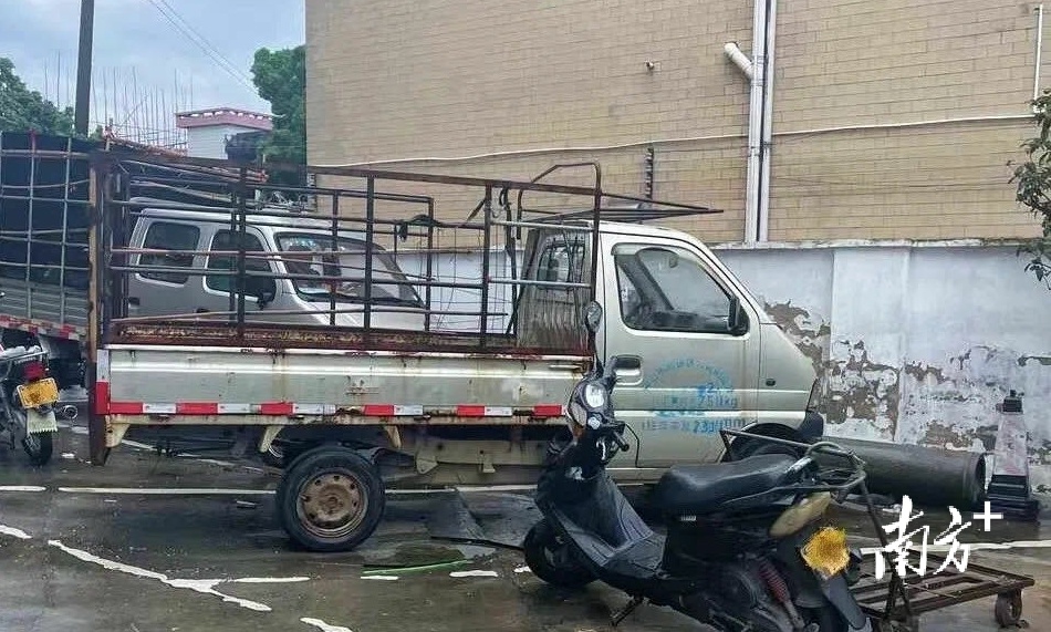 根据网友反映的情况,陈村交警中队执勤民警来到园林新街,只见一辆布满灰尘、锈迹斑斑的银色小货车停在公共停车位上,左侧后轮胎早已不知所踪,车身积满了厚厚一层灰,另一个停车位上停放着一辆轮胎生锈的摩托车,旁边紧挨着一辆早已不能使用的手推车。