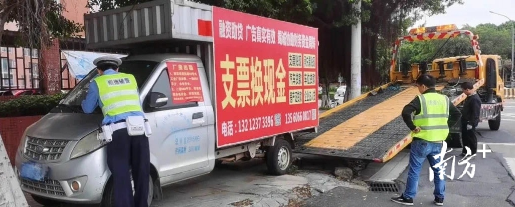 在容桂宝昌西路,容桂交警中队民警在巡逻中发现一辆贴满车身广告的小货车停在人行道上,不仅严重影响道路环境,还给行人和附近小区居民带来了安全隐患。经排查,该车已经处于报废状态,交警多方尝试无法联系车主,于是将车辆拖走暂扣作进一步调查处理。