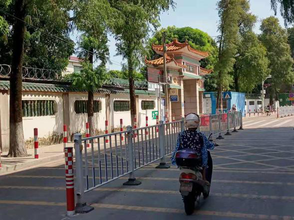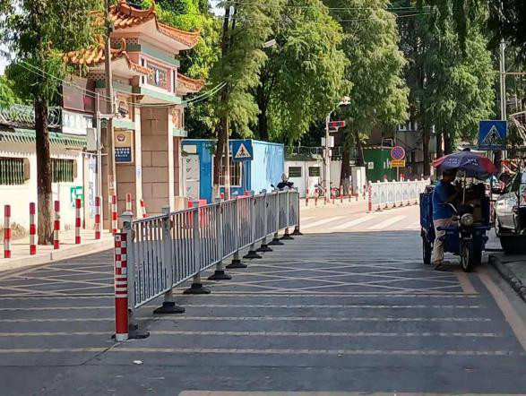 通过路中间设置中间分隔栏、校门口路段安装自动违停抓拍枪等措施,有效对来往车辆引流,缓解拥堵,目前车辆通行顺畅。