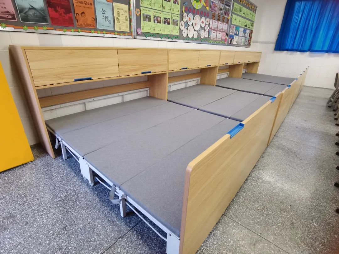 学校因地制宜,发掘校园内有限的场地资源,在不影响功能室场使用情况下,将教师会议室等室场功能重组合并使用,以建造“学生睡室”和安装“抽拉床”解决全校学生“躺床睡”问题。3月12日,学生午休床施工安装已全部完成,并于3月14日正式投入使用。