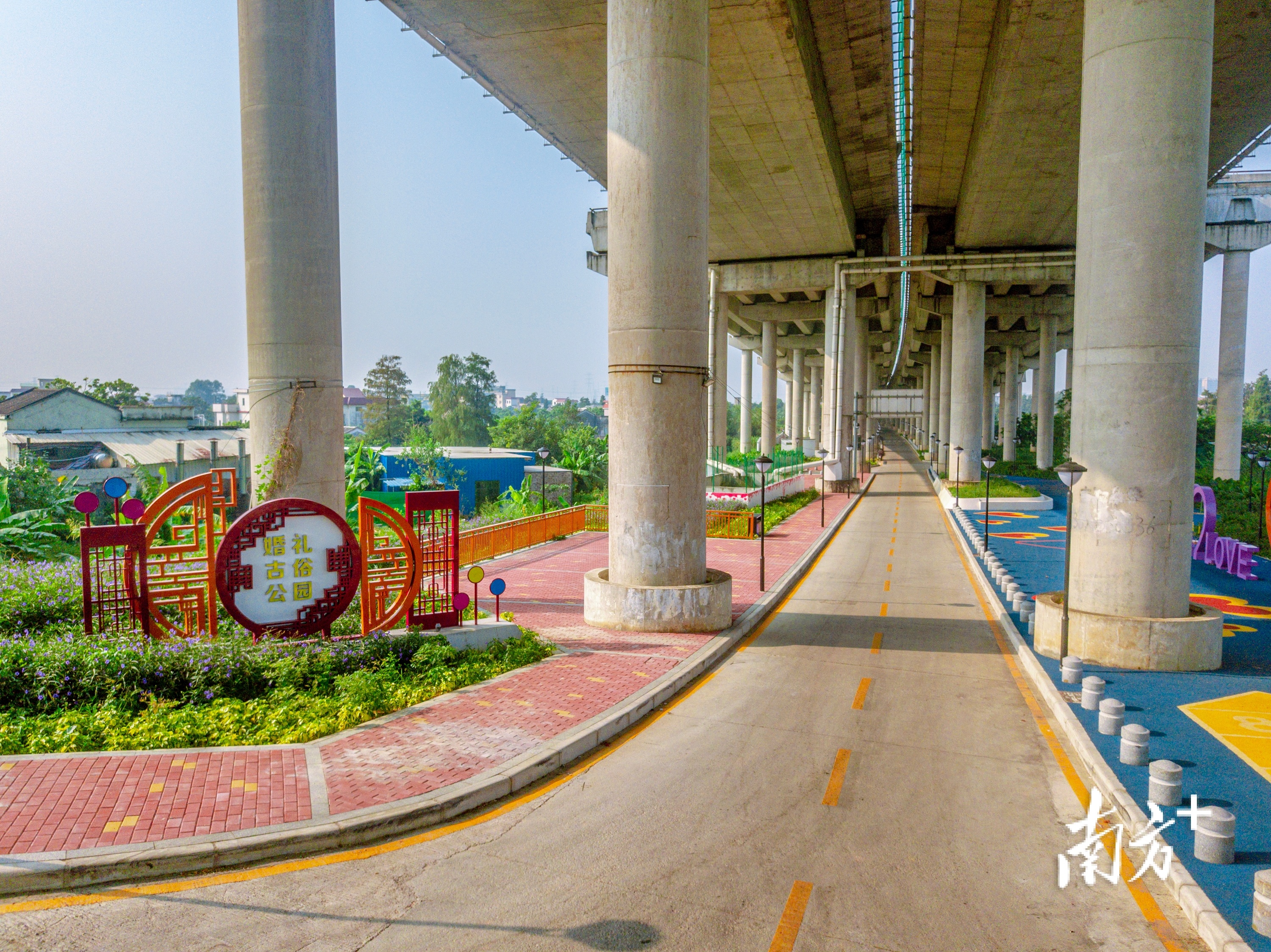在均安桥下空间改造成果中,尤以有着“南沙婚俗公园”之称的杏均特大桥桥下空间最具特色。