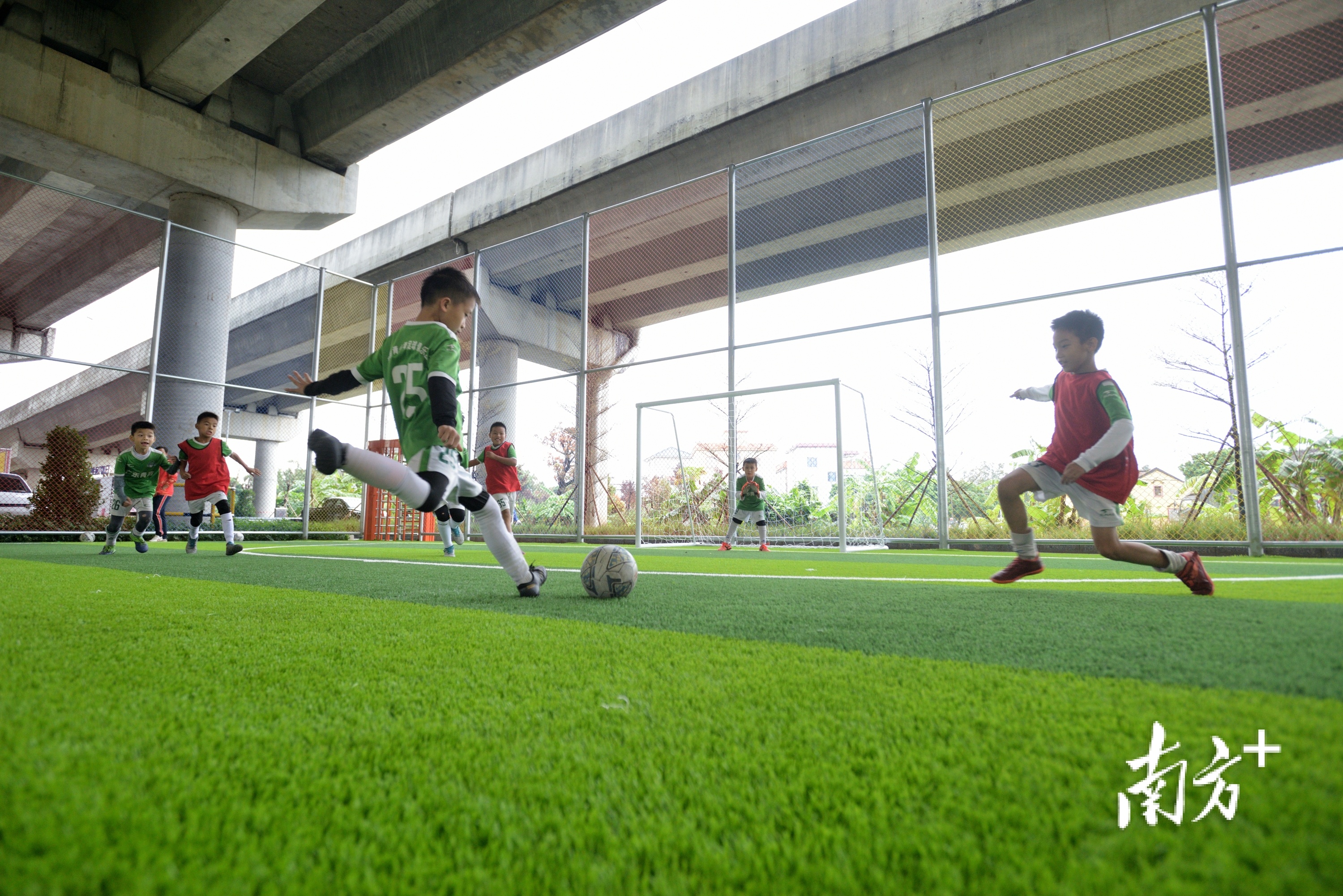 均安在佛江高速永隆段桥下空间,建有设备齐全的足球场,满足了周边儿童运动需求。 甘培田 摄