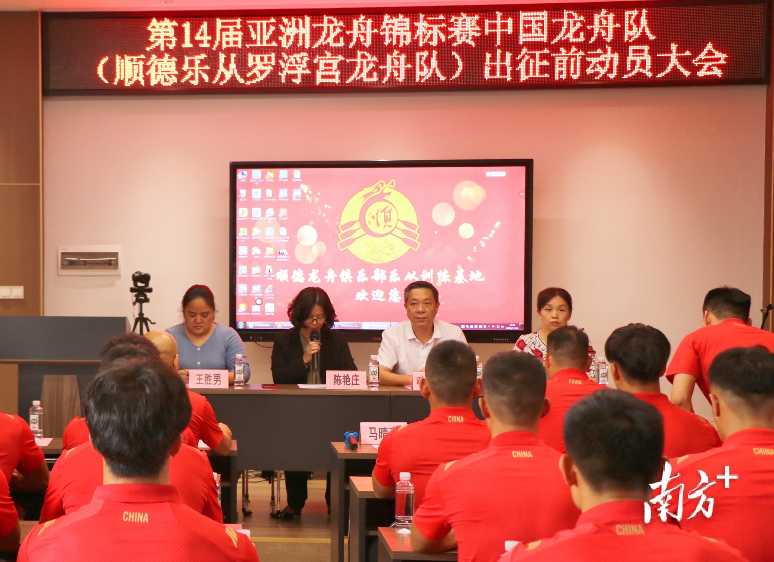 11月16日下午,第14届亚洲龙舟锦标赛中国男子龙舟队(顺德龙舟俱乐部乐从罗浮宫龙舟队)出征前动员大会在顺德龙舟俱乐部乐从训练基地内举行。