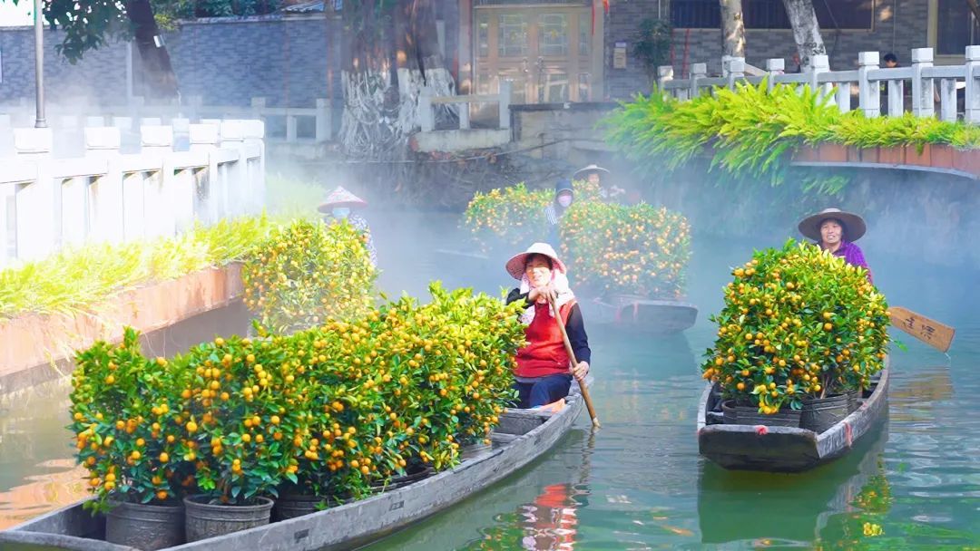 在陆路交通不发达的年代,每逢春节前,桔农们还会摇船把年桔运输到珠三角和港澳地区销售。陈村的河涌出现千船万舸满载金黄的桔果,远望好像一船船的黄金在河里漂流,引人注目。