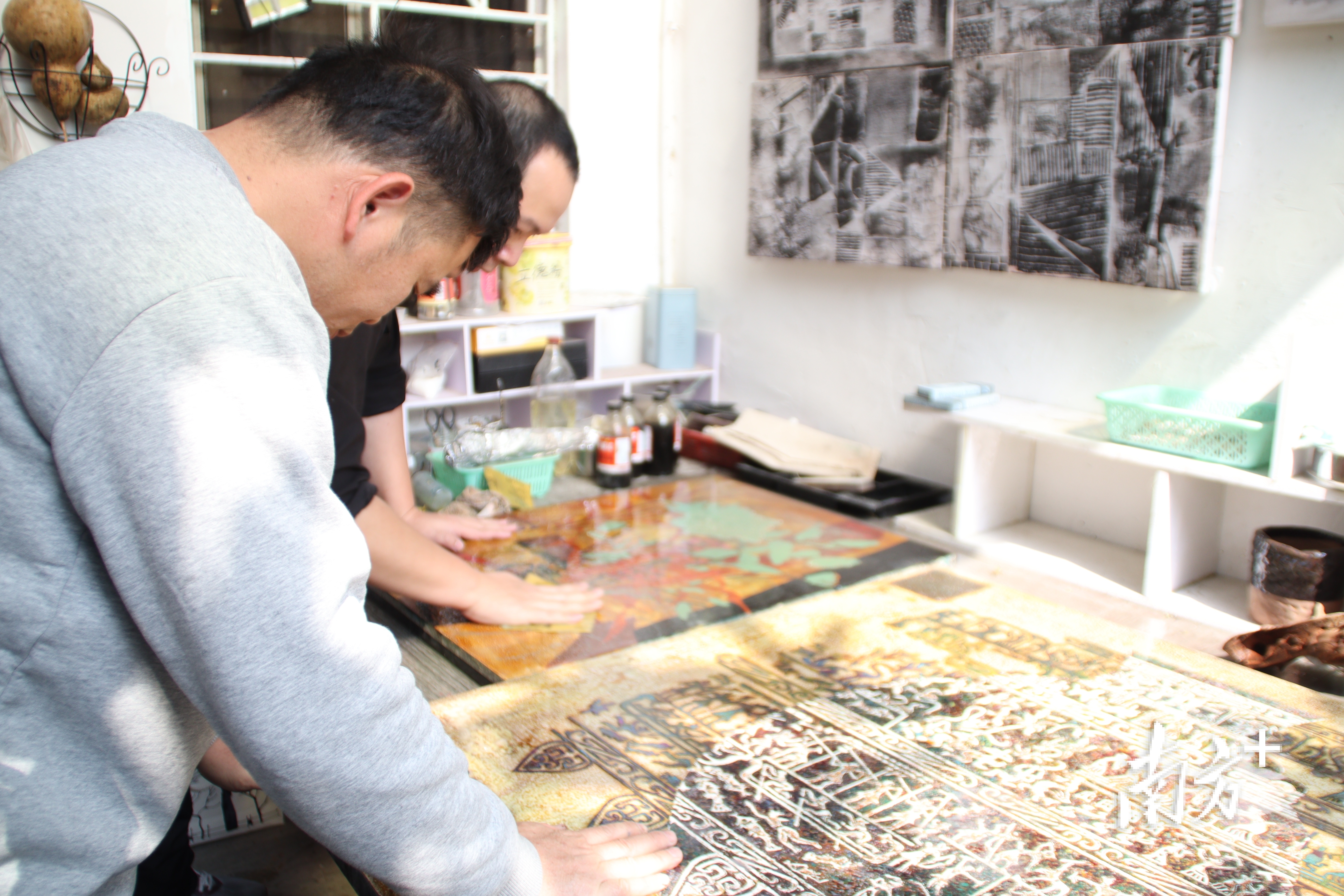 南风艺术部落成员陈敏枝正在为自己的漆画作品贴蛋壳。