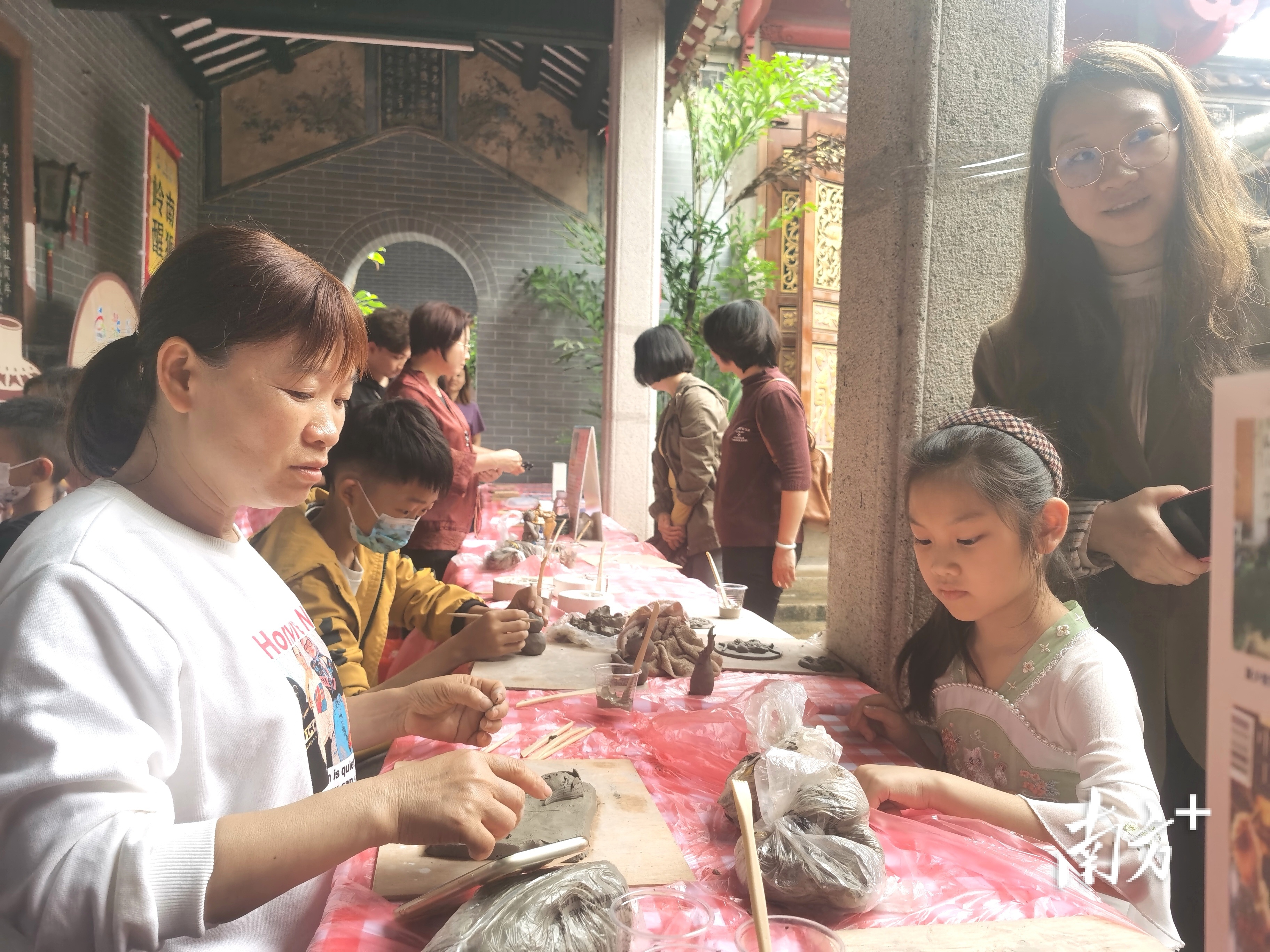 岑氏大宗祠内的陶艺体验区吸引小朋友们踊跃参与。 南方+ 欧阳少伟 拍摄