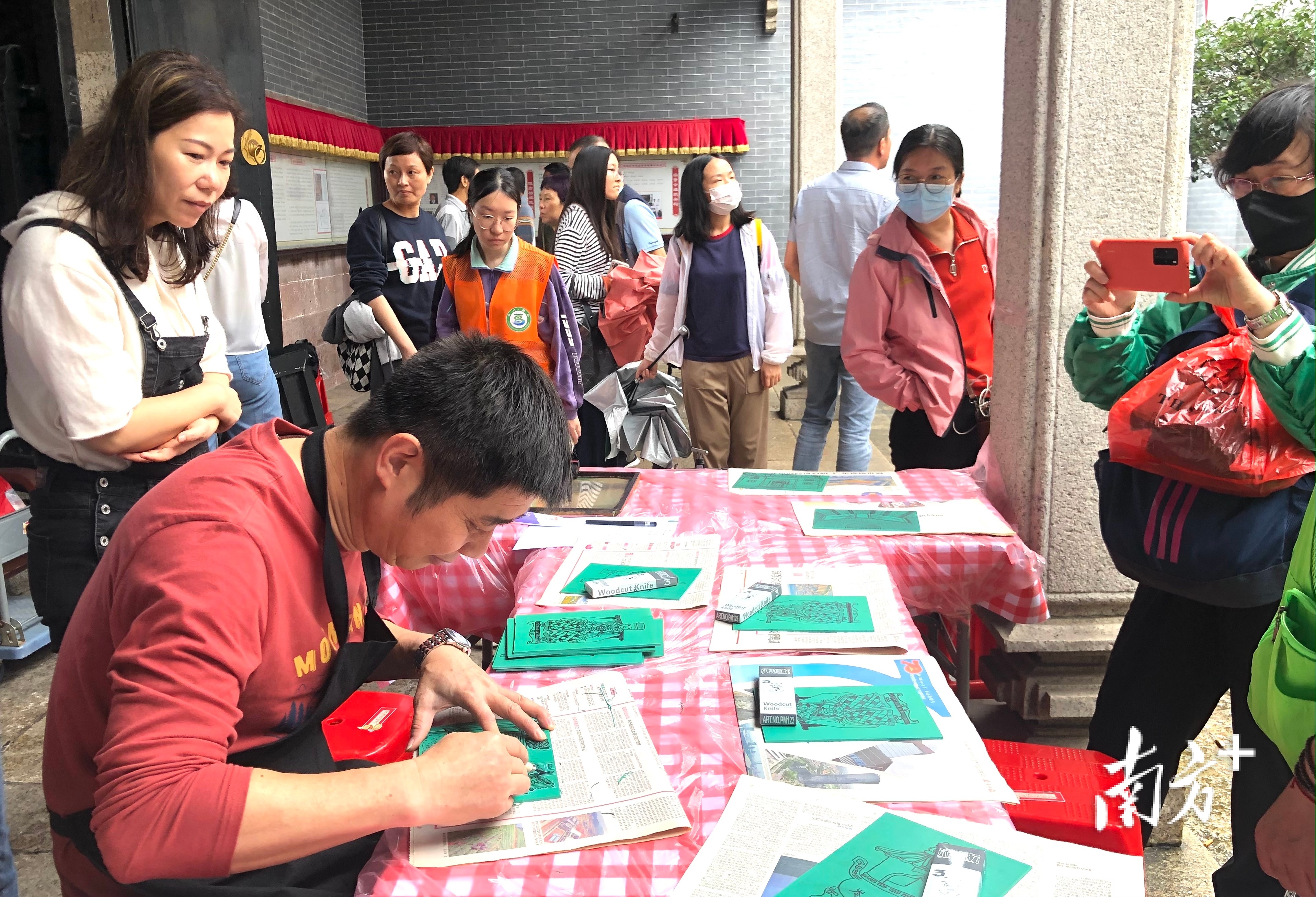岑氏大宗祠内的版痕画印体验活动吸引村民游客驻足观看。 南方+ 欧阳少伟 拍摄