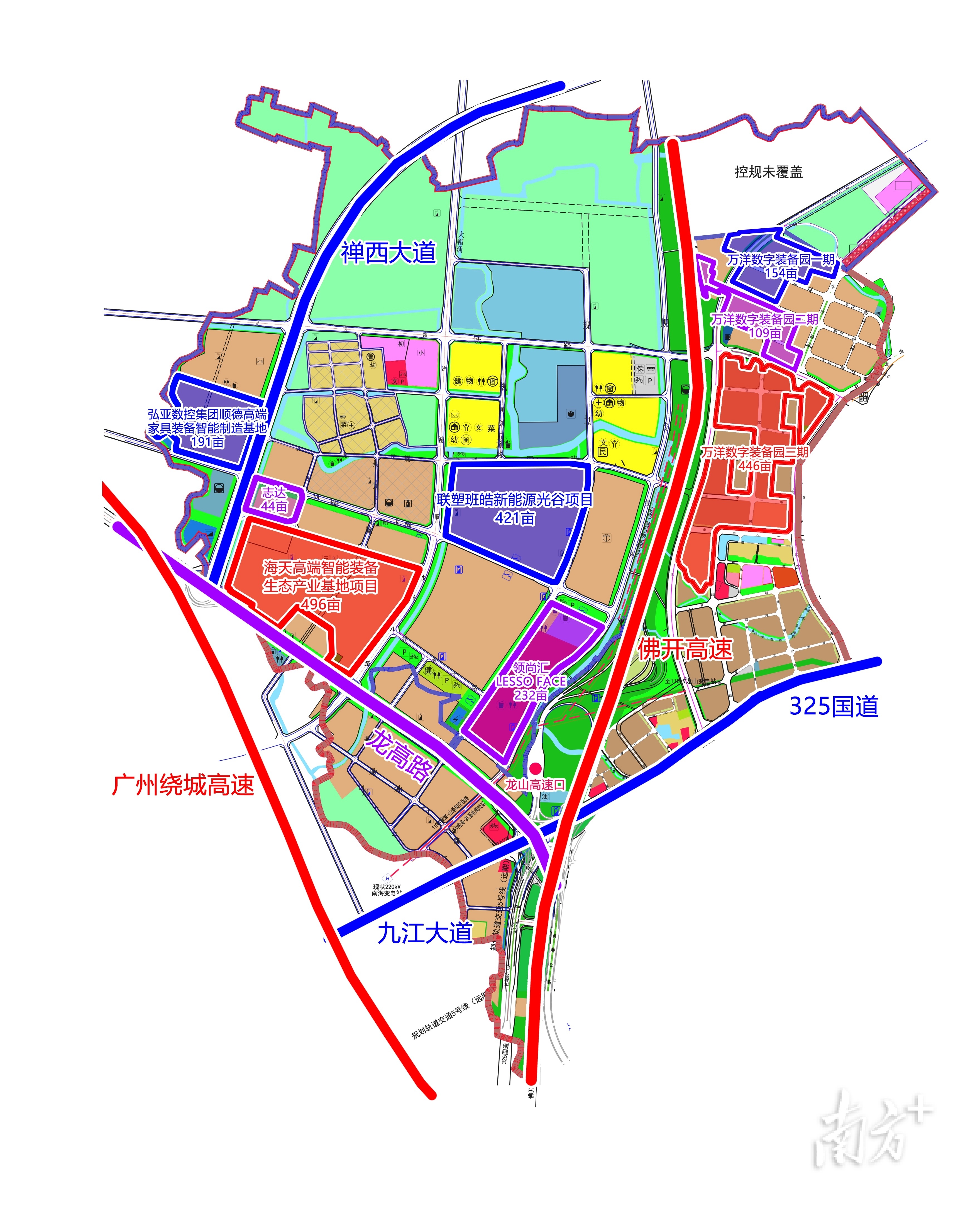 目前,佛山九龙高端装备及新材料制造产业园(顺德片区)已经落户项目6个,总供地面积约2093亩,总投资超218亿,预计达产年销售收入超154亿元,纳税超9.7亿元,分别为:海天高端装备智能生态产业基地、弘亚数控集团顺德高端家具装备智能制造基地、联塑班皓联塑新能源光谷项目、龙峰志达汽车部件生产基地项目、万洋数字装备园1-3期、领尚汇LESSO FACE等项目。