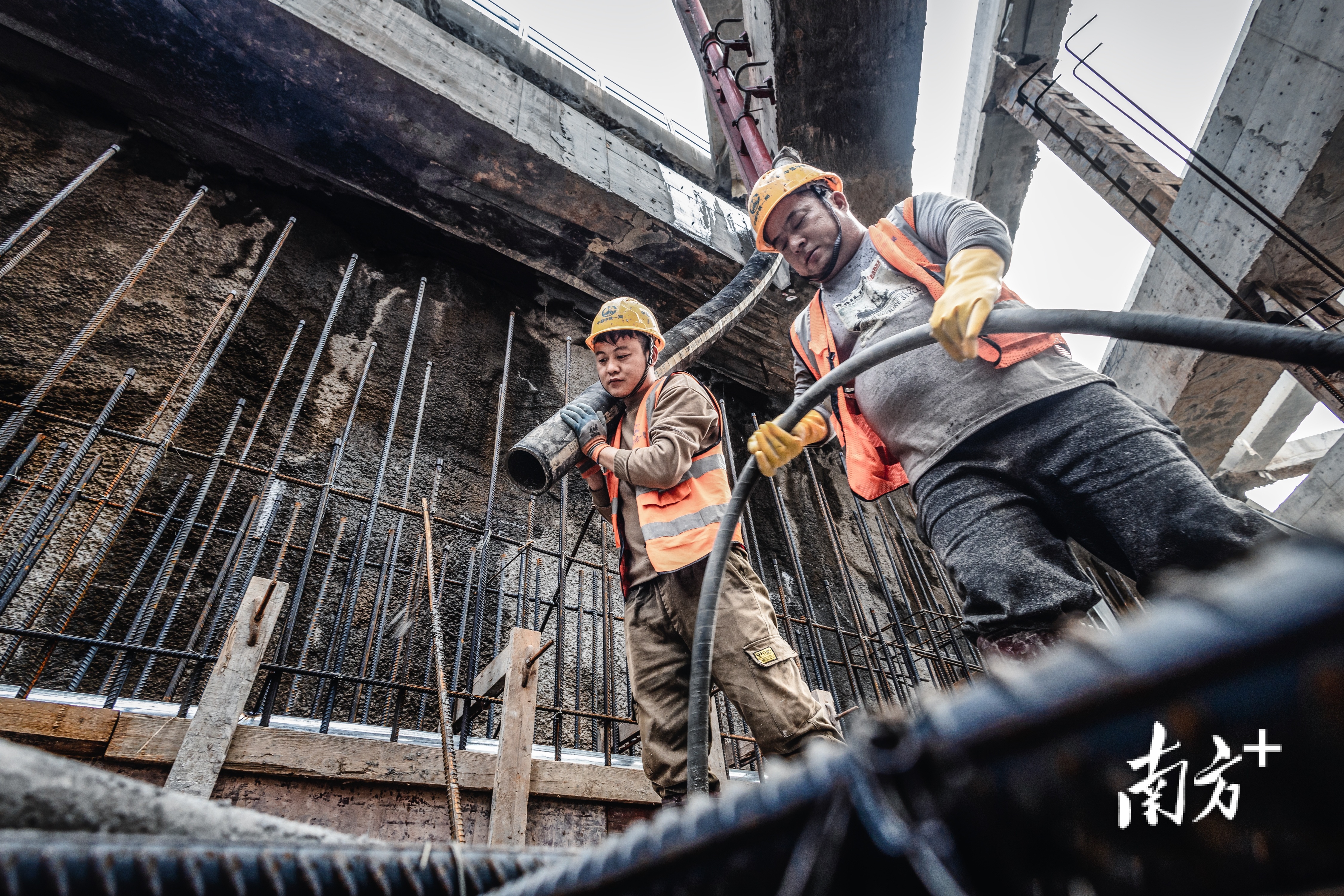 工人正在进行基坑底板浇筑混凝土浇筑作业。陈浩华摄