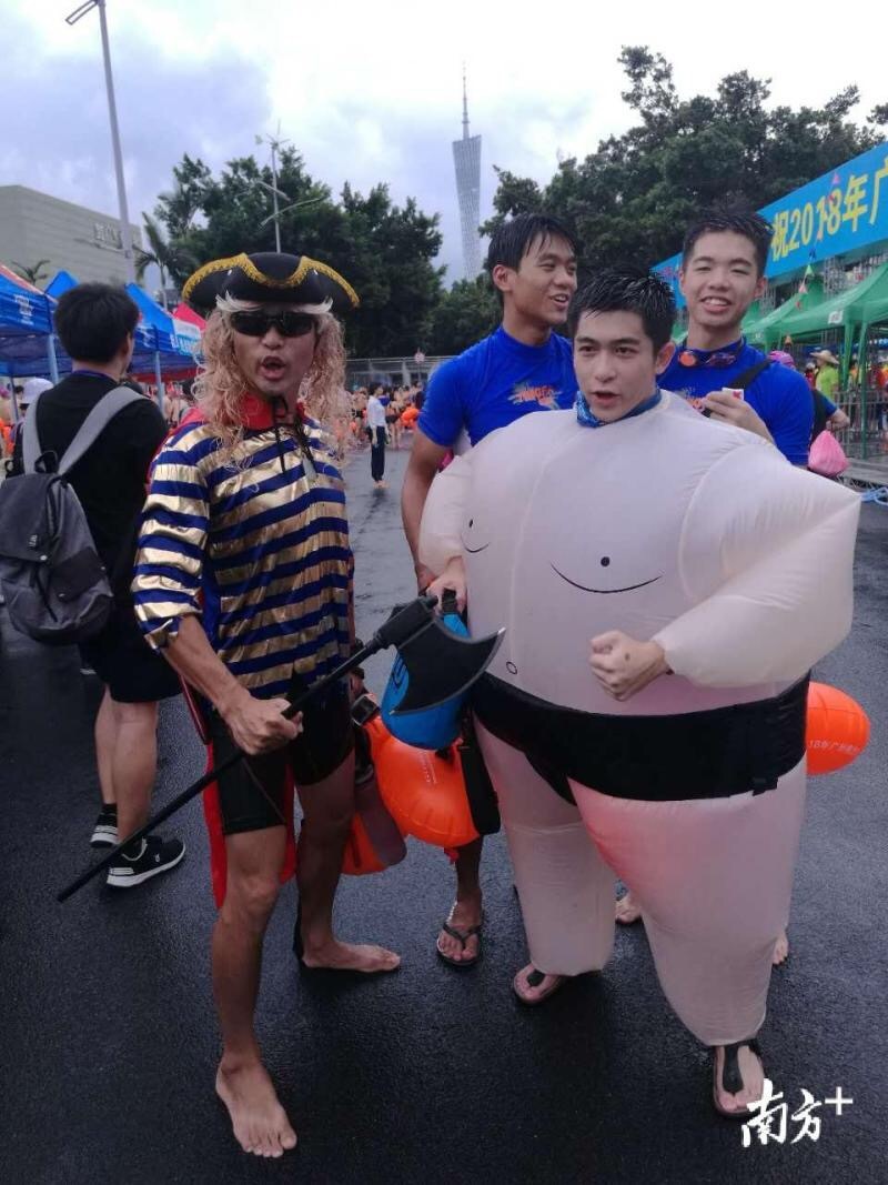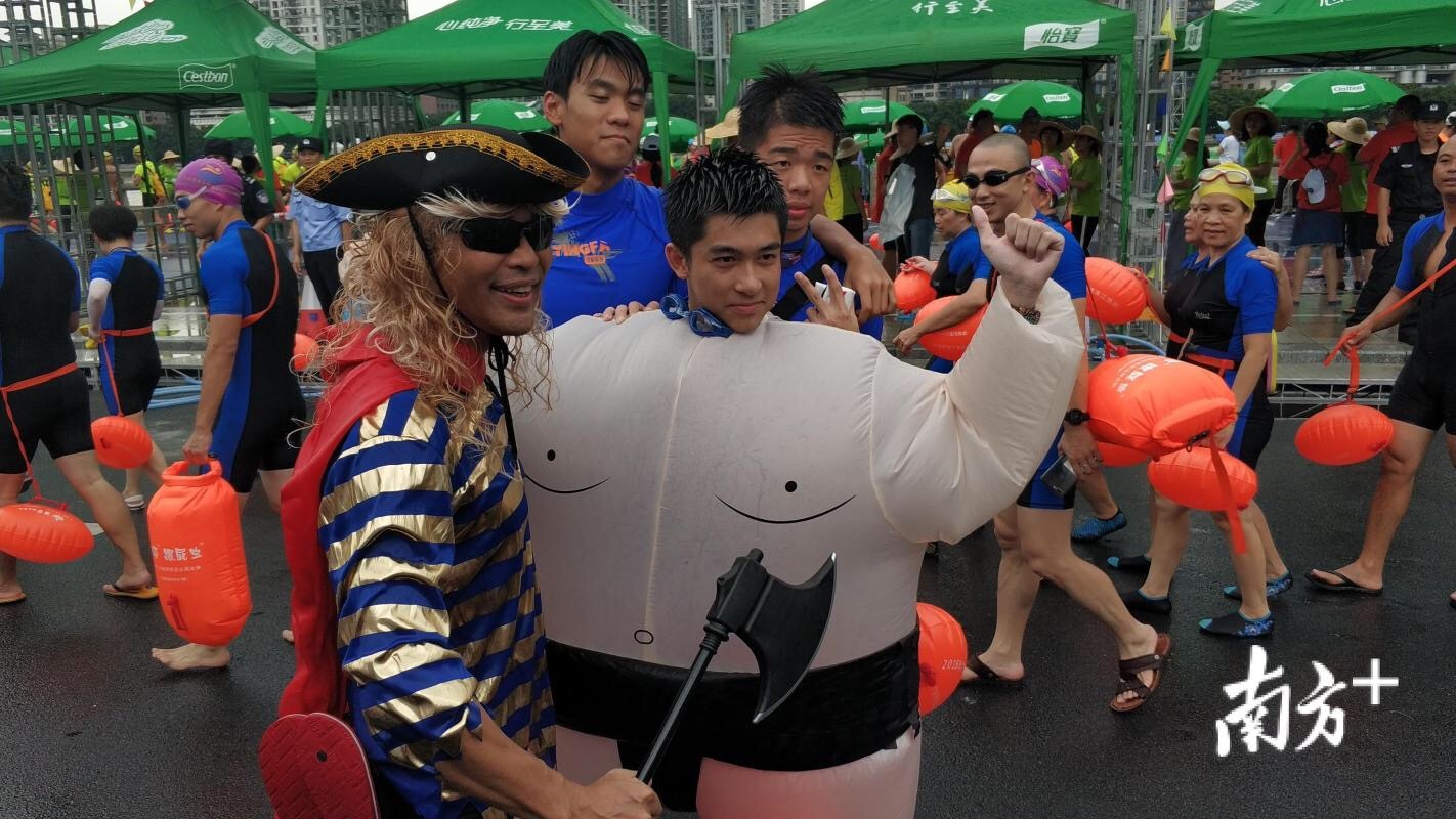 作为海珠方阵的领队,曾健每年都会选择不同的装扮。今年他别出心裁地选择了船长装。“船长代表着我作为海珠区的领队,带领大家一起横渡珠江。” 同时,他也表示,之所以年年玩造型,也是为了让方队的人看得更清楚,游得更安全。