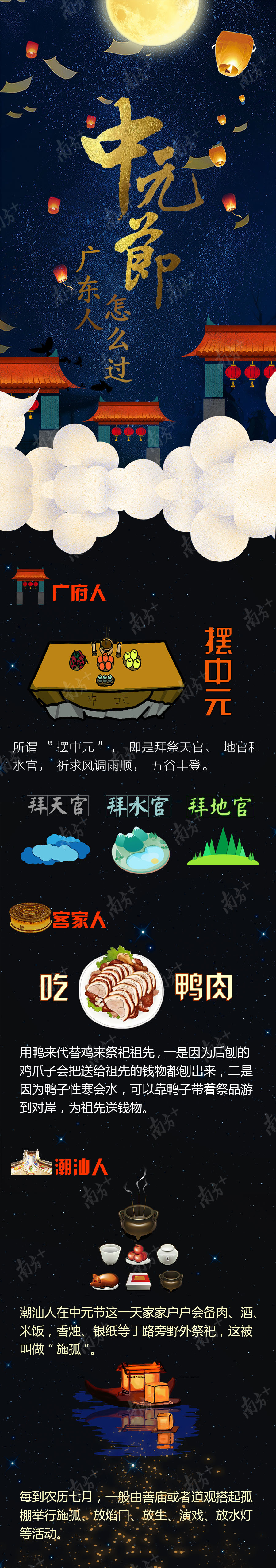除了常规的祭祖先、放河灯、烧街衣、祈丰收这些常规的中元节活动,广东各地都有什么特点呢?