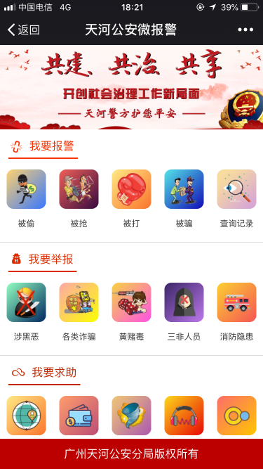 1 关注“广州天河公安”公众号,点开“微报警”栏目,看到三大类报警类型,根据“紧急类”和“非紧急类”分为“我要报警”“我要举报”“我要求助”。
