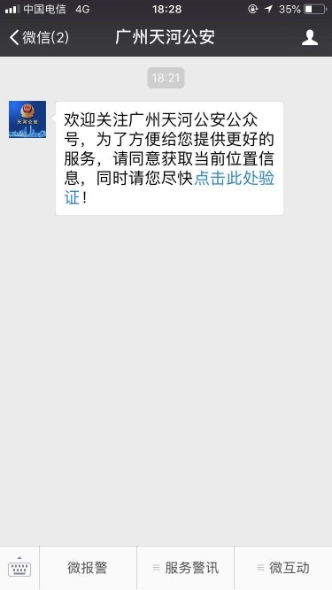 针对群众乘坐网约车、出租车出行遇到一些安全问题,天河警方今年5月在公众号上开发了“微护航”服务,群众使用护航服务后,每60秒自动向公众号发送定位,遇到紧急情况可以一键报警。