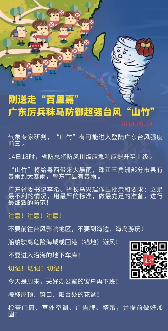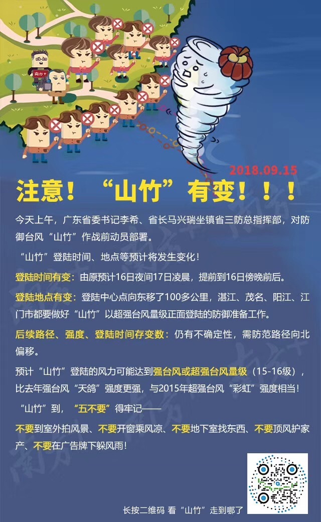 登陆地点移了。向东移了100多公里,湛江、茂名、阳江、江门市都要做好“山竹”以超强台风量级正面登陆的防御准备工作。