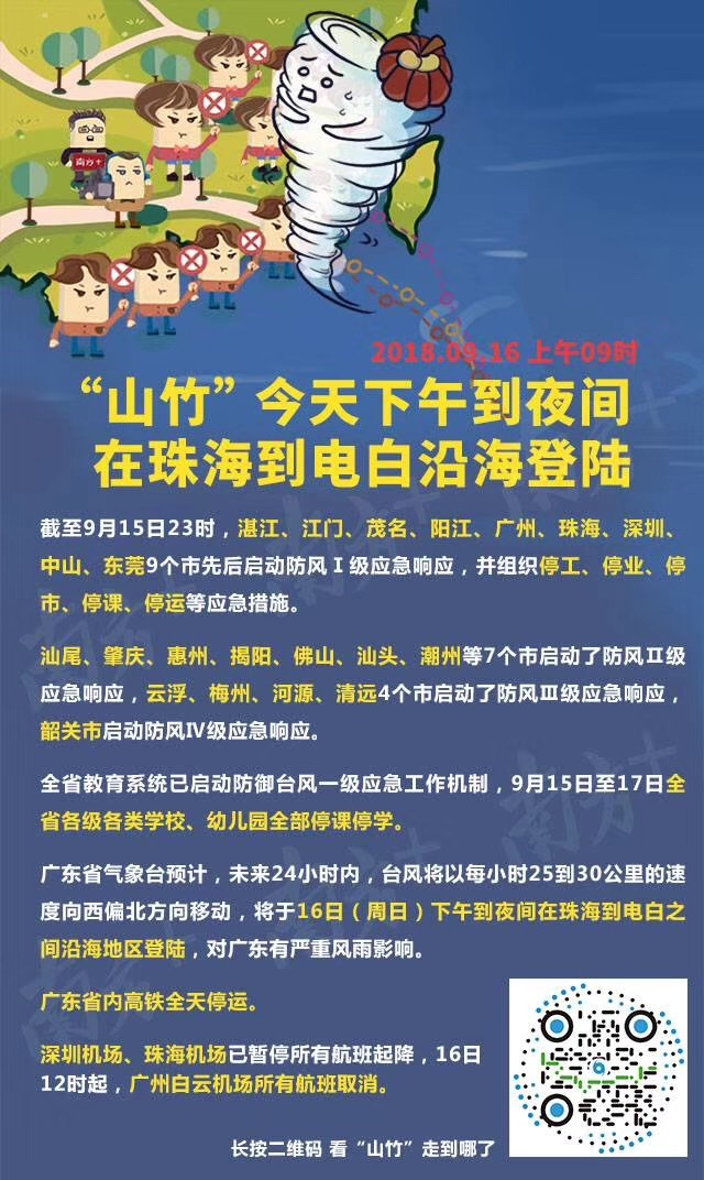 广东省教育厅通知:从9月15日18时起至9月17日,全省各级各类学校、幼儿园全部停课停学,少年宫、校外培训机构全部停止一切培训和教育活动,寄宿制学校学生原地做好防台风工作。