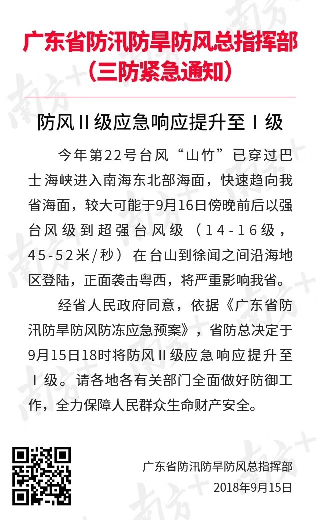 依据《广东省防汛防旱防风防冻应急预案》,省防总决定于9月15日18时将防风Ⅱ级应急响应提升至Ⅰ级。请各地各有关部门全面做好防御工作,全力保障人民群众生命财产安全。