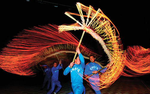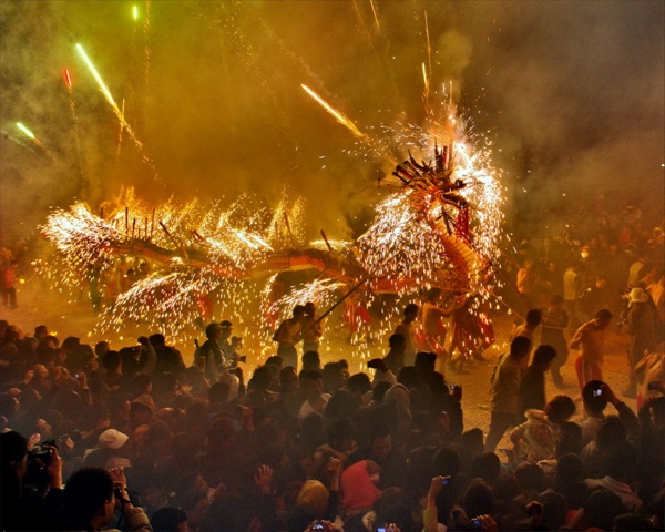 埔寨烧火龙已有三百年历史,火龙制作是由竹篾、稻杆扎成龙的形状,以硫磺、白硝、木炭末配成的火药,制成火箭、火花等燃放,经过几百年来的不断演变,火龙由原来的三、四段发展到如今的十一段,长达三十余米在龙身上安装烟花、炮竹、火箭多达数千枚,龙头、龙尾装的火药更数不胜数。一条火龙由三四十个赤膊青年手擎,加上鼓乐手、龙虾、金鱼等人,整个队伍达200多人,表演奇特,惊险壮观。像丰顺埔寨这样的“烧龙”,由村民自发筹款,志愿制作,舞龙时赤裸上身,舞着的龙身烟花绽放、火箭飞射,不惧烫出泡来的民俗,对比全国的“烧龙”,堪称“奇特”。