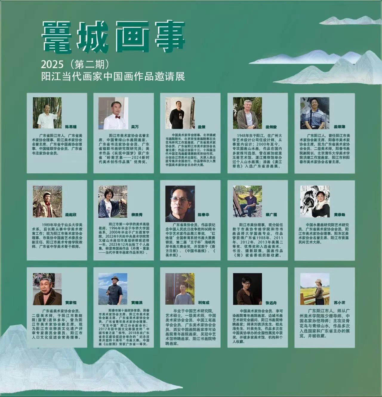 展览展出陈思瑞、吴万、梁策、梁炳俊、梁荣潮、梁起欣、柳显秀、陈春华、蔡广福、黄恭勋、黄家恒、黄耀浪、利有成、张迟舟、苏小雲15位阳江当代画家创作的优秀美术作品,呈现阳江独特的地域文化、风土人情以及时代风貌,促进文化艺术的传播与发展。展期持续至4月27日。
