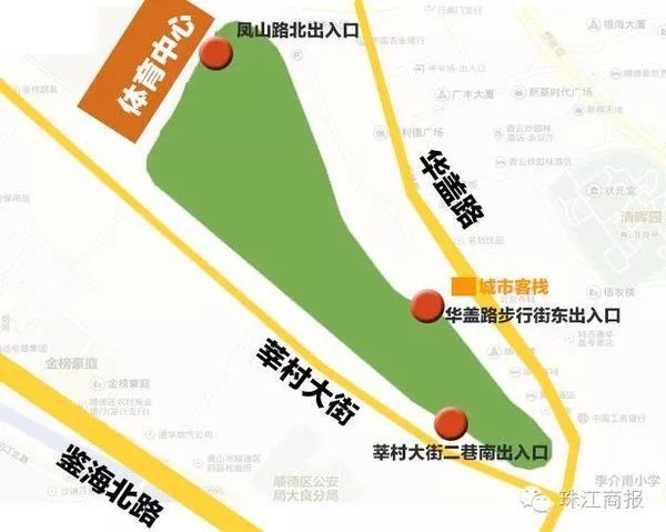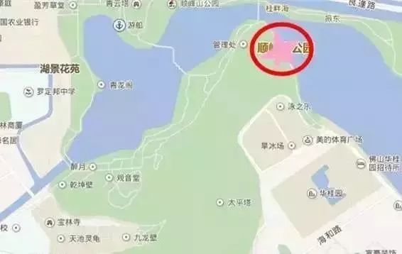 龙舟汇位于顺峰山公园的龙舟景观带,景观带位于图中星号位置,靠近美的体育公园