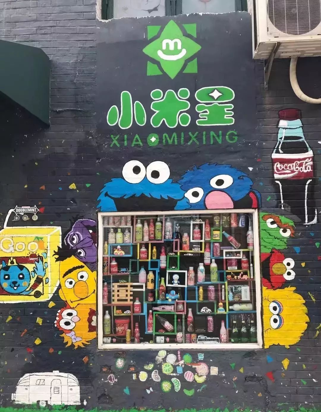眼前这间布满涂鸦的零食店,让人过目难忘,就连旁边的芝麻街外墙,也被童趣的涂鸦填满。