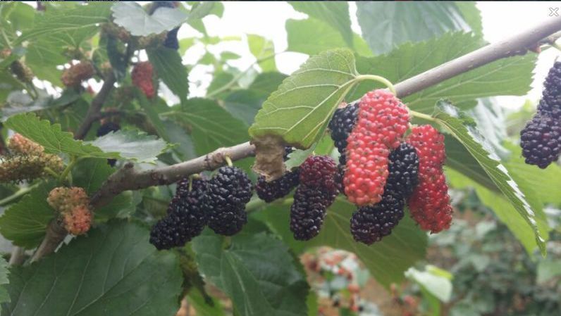 沿着果园小径行走,你会发现果园内的桑果品种也是非常多呢!这些桑树很多是嫁接的“果肉树”,其中包括良种桑、伦40桑树、大十果桑、荆桑、台湾长果桑、大白果桑等多个名品种。