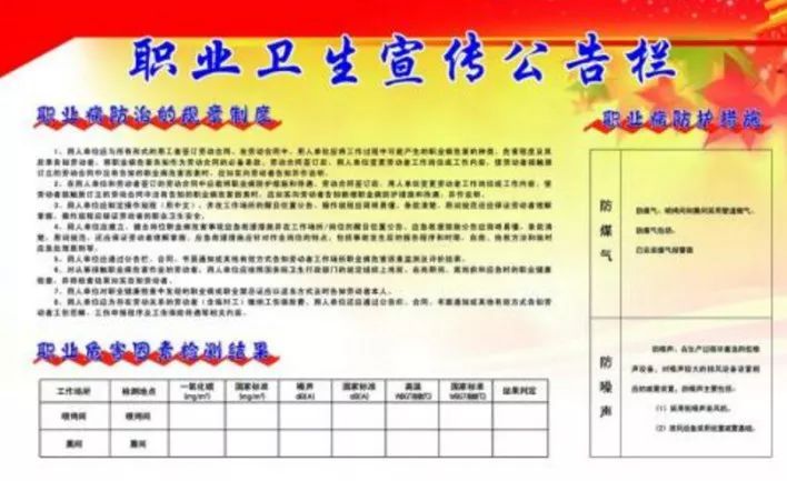 其次是公告栏,用人单位应当在醒目位置设置公告栏,如企业门口、车间门口、饭堂等劳动者必经之地,“哪里显眼贴哪里,哪里人多贴哪里”。公告栏里应公布有关职业病防治的规章制度、操作规程、职业病危害事故应急救援措施和工作场所职业病危害因素检测结果。快去看看你们的公告栏有没有这些内容。