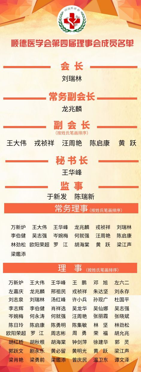 “芳林新叶催陈叶,流水前波让后波”! 在中国实现从“赶上时代”到“引领时代”的伟大跨越中,我们顺德医学会也在各级部门领导的亲切关怀下,在社会各界的大力支持下,成为了政府连接全区广大医务科技工作者的桥梁和纽带,成为发展我区医学科技和卫生事业的重要社会力量,成为了社会信誉较高、发展能力较强、服务水平先进的优秀学术团体。