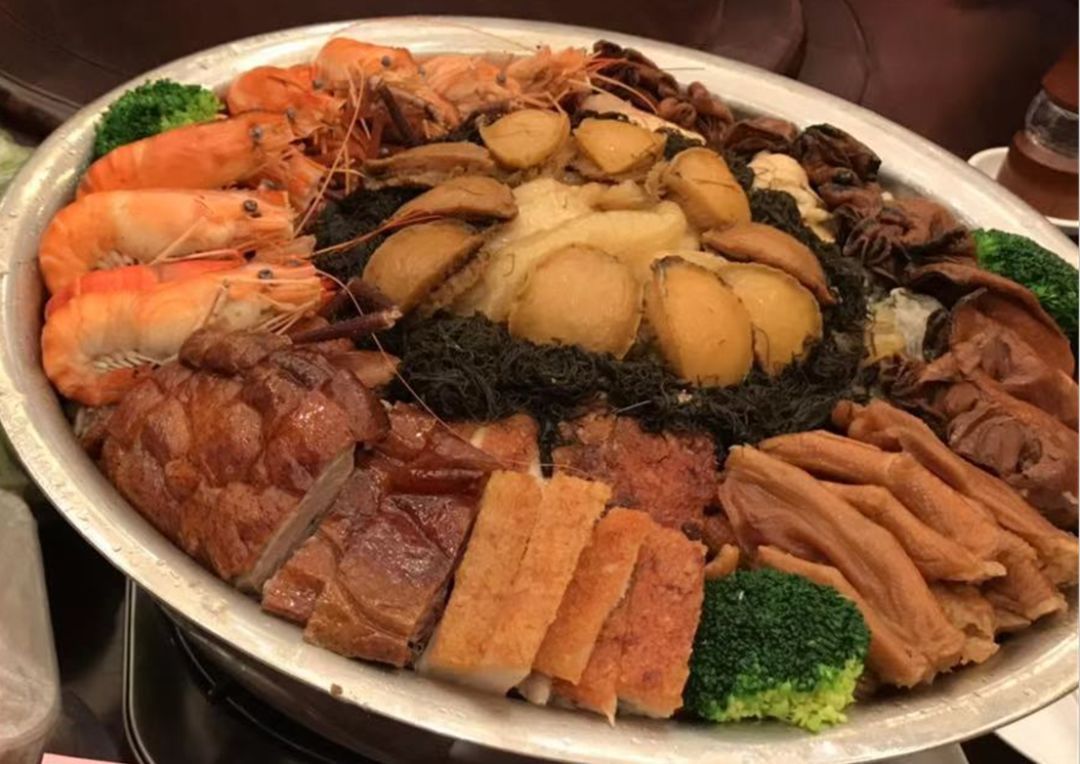 今年的吉祥如意盆菜,由龙江人人酒店精心制作。满满的一大盆,里面有东头烧肉、白切鸡、大连鲍鱼、花胶、罗氏虾、螺片、烧鹅、发财蚝市、鹅掌、发财鱼丸、扣肉等,每一道食材经过精心烹制,多种食材汇聚一盆,味道相互渗透,馥郁香浓,令人回味无穷。