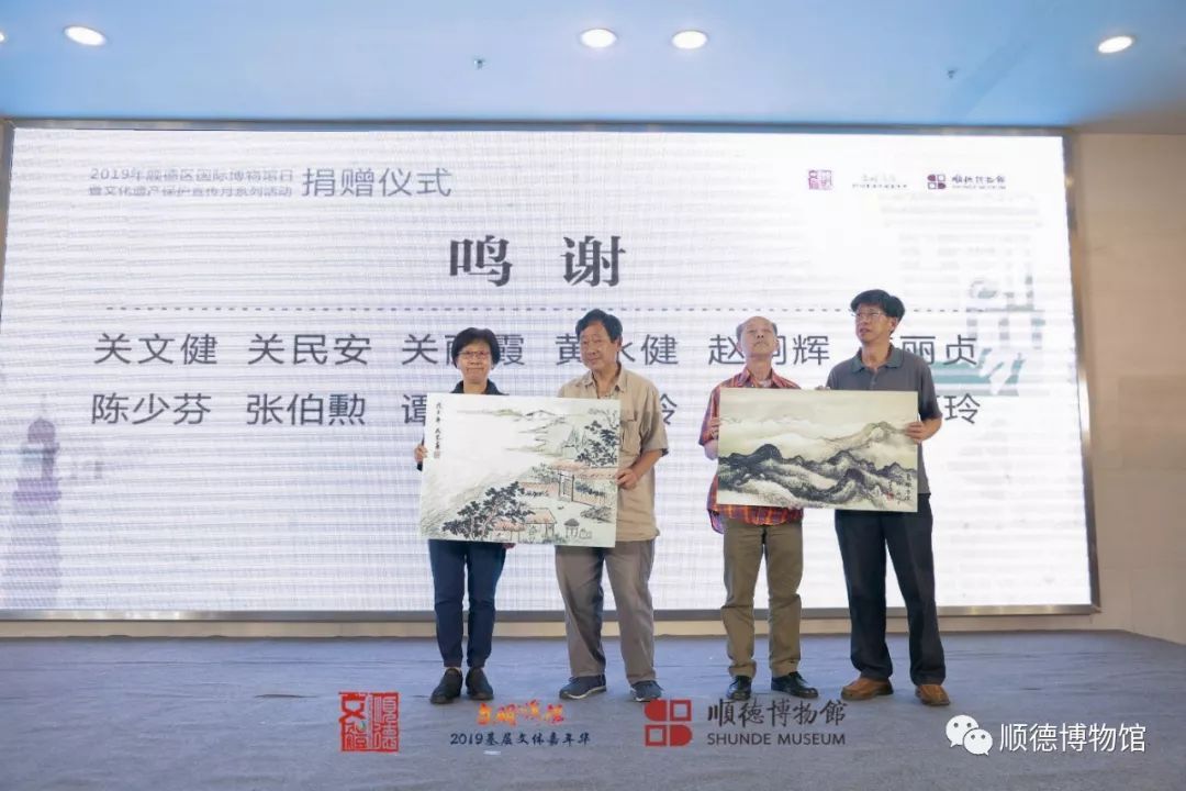 关文健、关民安、关丽霞、黄永健作为代表向顺德区博物馆捐赠关应良、关民光先生书画作品一批