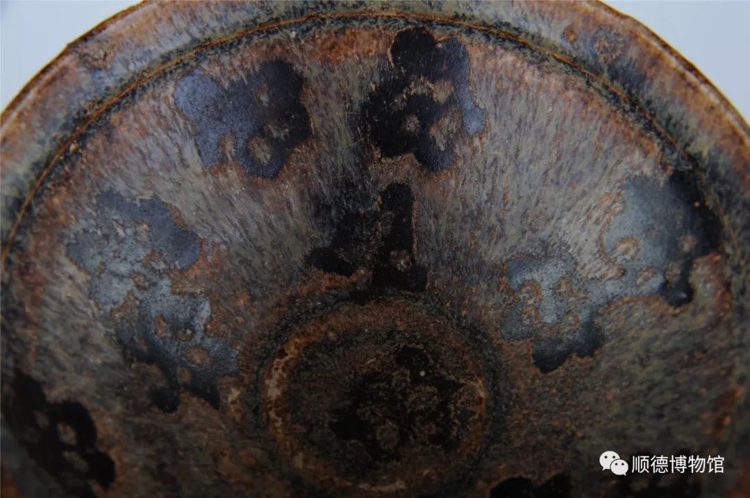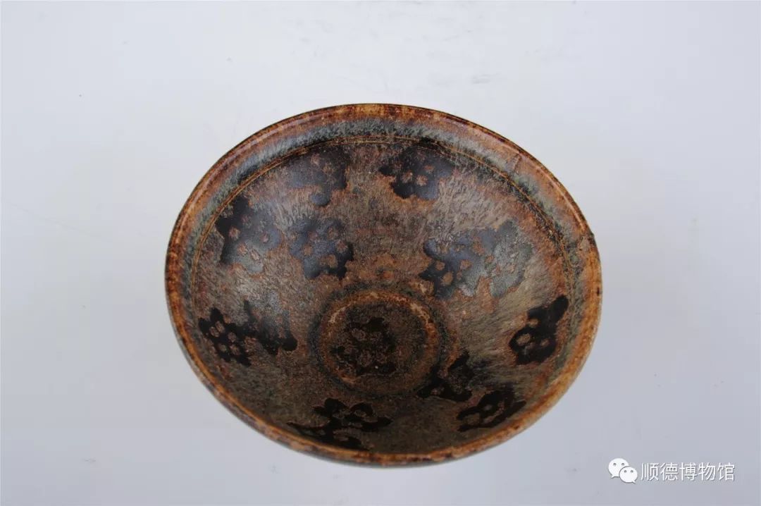 我的口沿外敛内折,深腹,矮圈足。盏内壁施兔毫釉为地,上饰十数瓣梅花图案。梅花的绰约风姿打破了黑色的沉闷,给斗茶的人更多乐趣。要达到这种效果,需采用一种叫“剪纸贴花”的工艺。这是吉州窑的独创。
