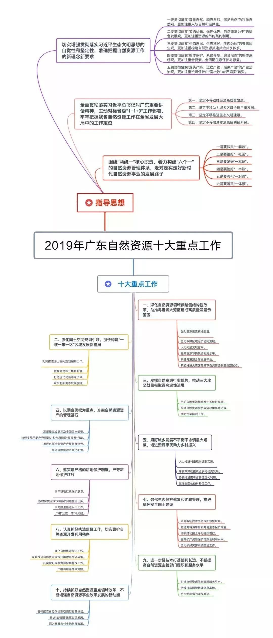 九是进一步强技术打基础利长远,不断提高自然资源主管部门履职和服务水平。打造自然资源信息管理服务平台,加快建立标准统一、互联互通、业务协同、信息共享的自然资源政务管理与决策支撑体系,继续落实“数字政府”改革建设工作部署,推动自然资源政务信息在部门间共享应用;持续打牢测绘地理信息基础,认真落实《广东省基础测绘“十三五”规划(2016-2020年)》;夯实新机构的运作基础,市县两级要坚持“优化协同高效”原则扎实推进机构改革各阶段任务,切实实现机构设置的优化、职能配置的协同、运行机制的高效。