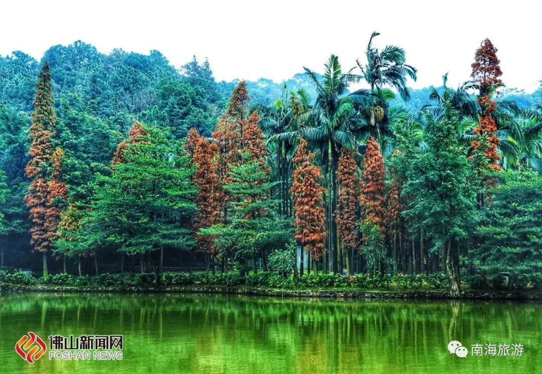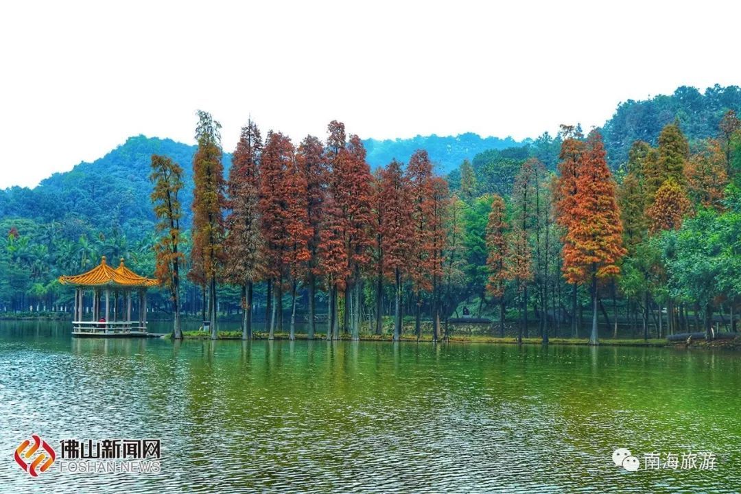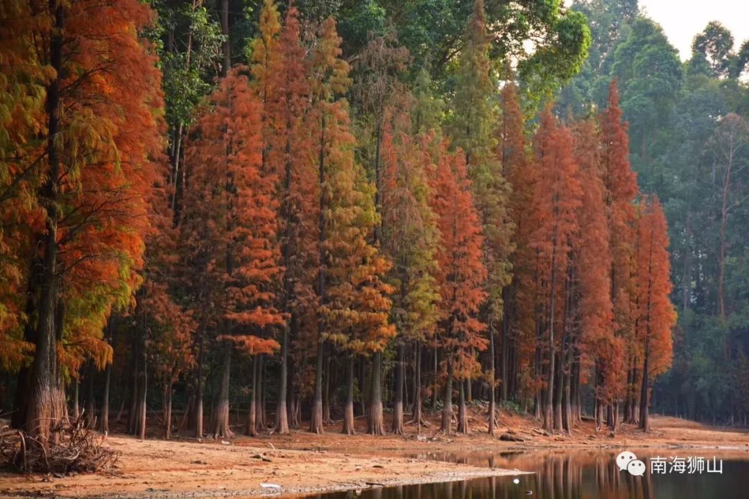 西樵山天湖公园的水杉也都换上了新衣裳,红彤彤的,在苍翠的常绿植被中尤为抢眼。