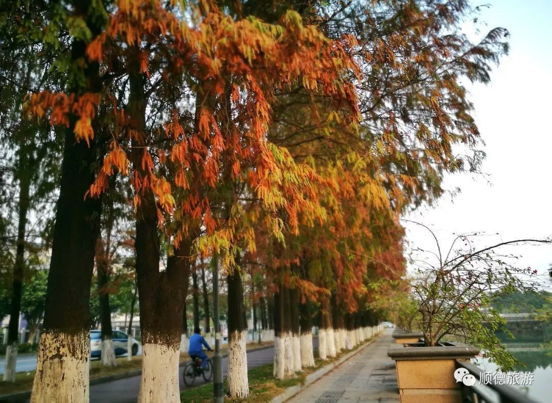 在伦教三洲,大片水杉林也一改夏日的葱郁,渐渐“披”上了橘红的冬装,给冬日的顺德带来了许多明亮的色彩。