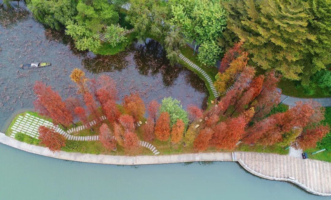 这里的落羽杉交织着红、黄、青三种颜色,尤如一幅油画,让人们感受到了季节变幻的即时感。
