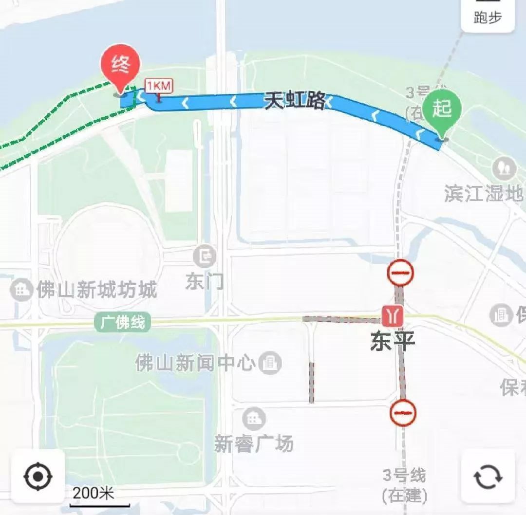 路线:从滨河景观公园到佛山新城露天泳场,全程约1.2公里