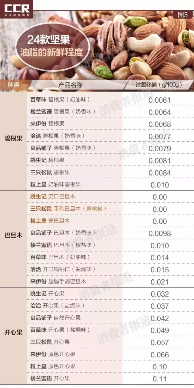 检测结果显示,24款坚果过氧化值均未超标,新鲜程度较好。