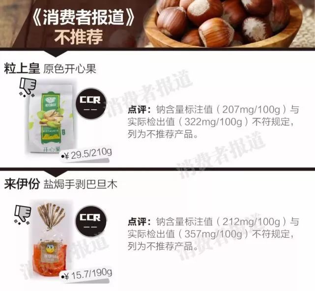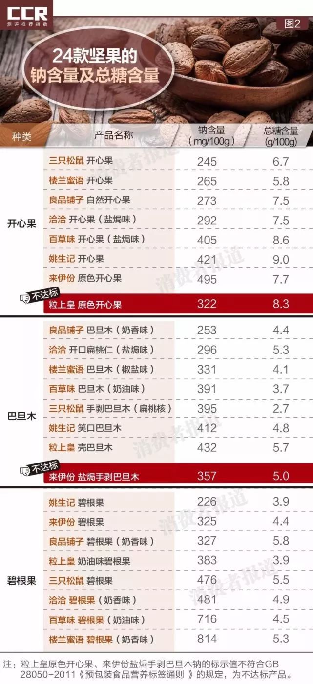 此外,粒上皇原味开心果、来伊份盐焗手剥巴旦木的钠实际检出量与其包装不符,属于不达标产品,有误导消费者之嫌,对需要控制钠的特殊人群和肾脏功能未发育成熟的幼儿尤为不利。
