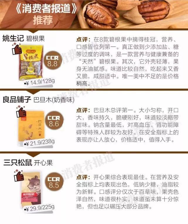 ➩ 5.口感评价中,姚生记笑口巴旦木、百草味开心果(盐焗味)、姚生记碧根果获评“最好吃坚果”;而来伊份盐焗手剥巴旦木、洽洽开心果(盐焗味)、良品铺子碧根果(奶香味)获评“最难吃坚果”。