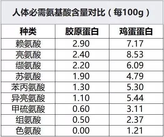 人体需要9种必需氨基酸,而胶原蛋白只含有6种,含量也远小于鸡蛋蛋白。此外,胶原蛋白中甲硫氨酸、组氨酸和色氨酸含量也均小于1%。