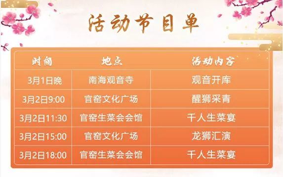 今年的生菜会将于3月2日在狮山官窑生菜会会馆举行,观音开库活动将在3月1日晚上开始,拿走这份节目单,来玩足一天一夜!