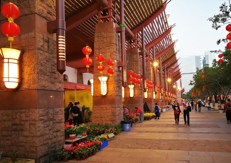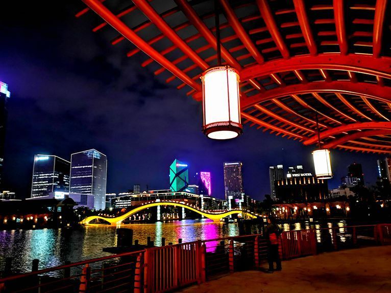 沿着千灯湖畔漫步,灯笼彩灯相伴