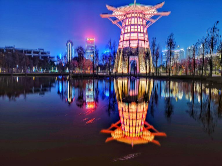 水杉林灯光与水体相互映衬