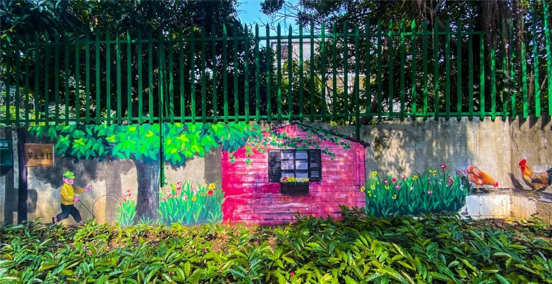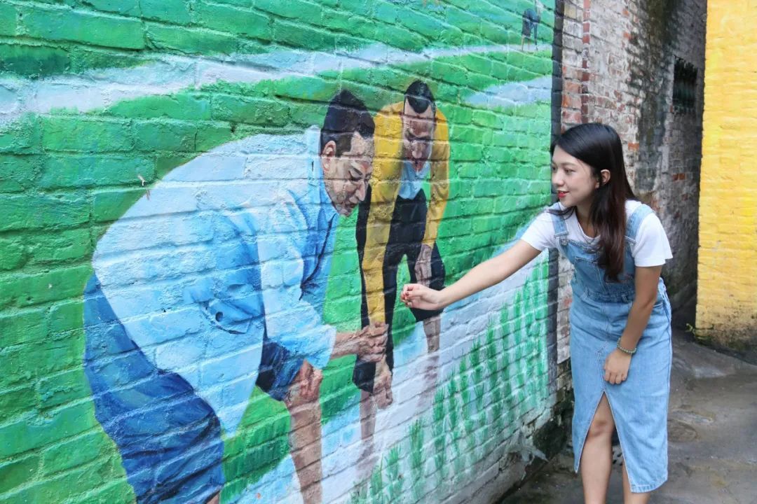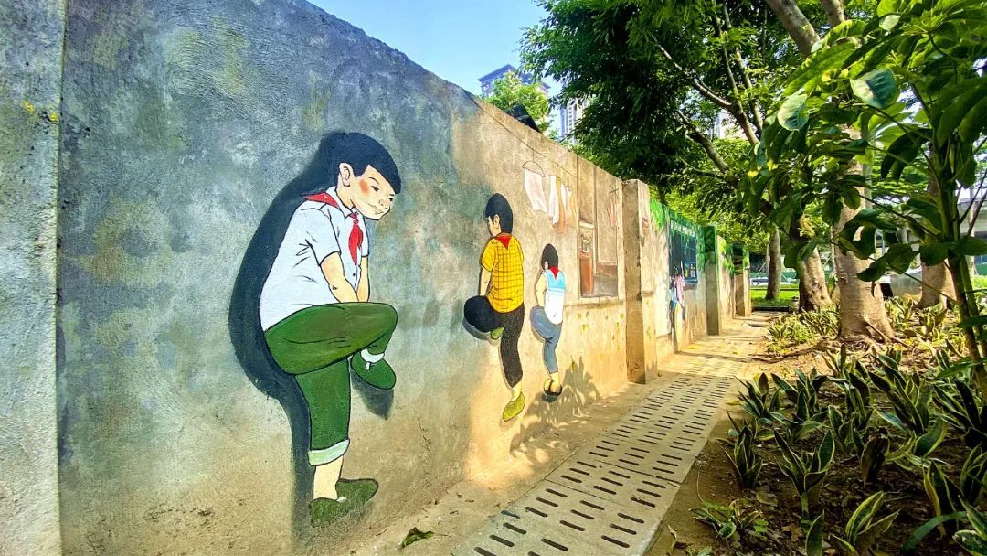 在佛山一环桥底,斑驳的墙面活用为怀旧画布,广东人的专属童年记忆跃然于上,周边的绿植、阳光随景入画。