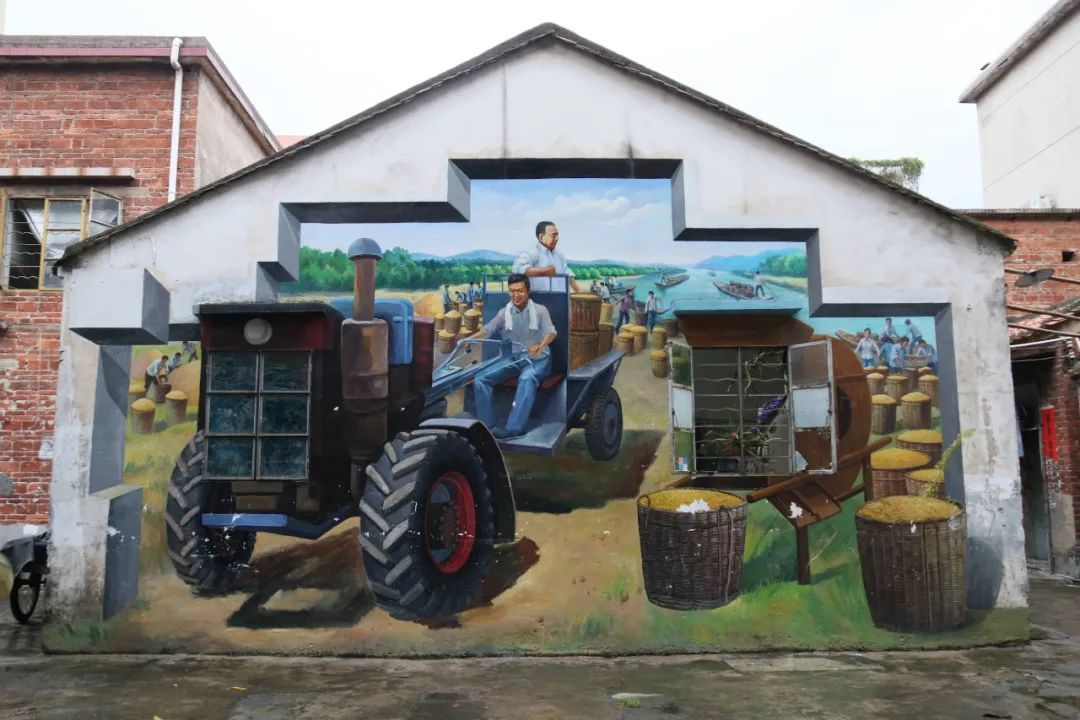 “手把青秧插满田,低头便见水中天…”,欧阳山当年与村民插秧的情景被绘上了墙。