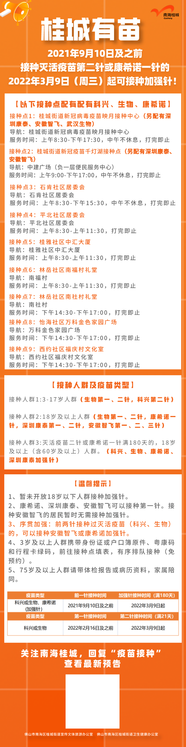 1、2021年9月10日及之前接种灭活疫苗第二针、康希诺、深圳康泰一针的,2022年3月9日起可接种加强针;2022年2月16日及之前接种科兴或生物第一针的,2022年3月9日起可接种第二针。