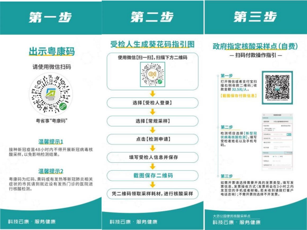 (2)接种新冠疫苗48小时内不得开展新冠病毒核酸采样,以免影响检测结果。如有粤康码为红码、黄码或有发热等新冠肺炎相关症状的市民请到就近设有发热门诊的医院进行核酸检测。