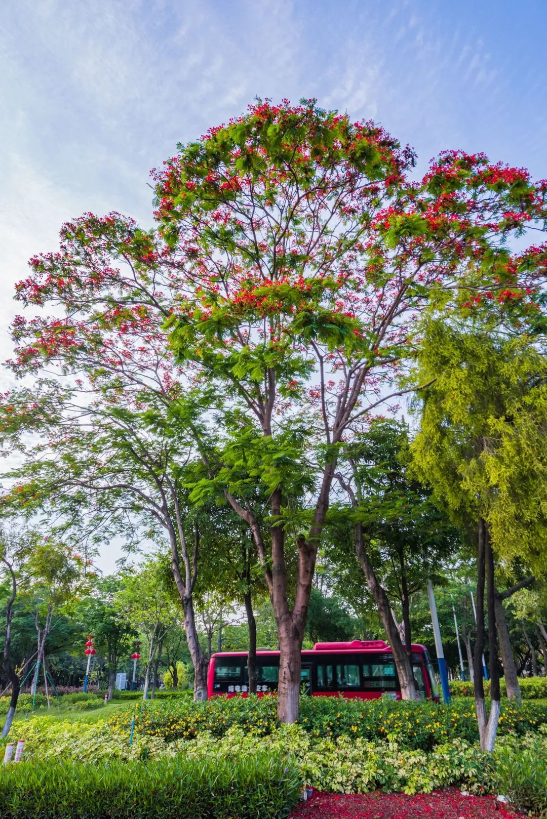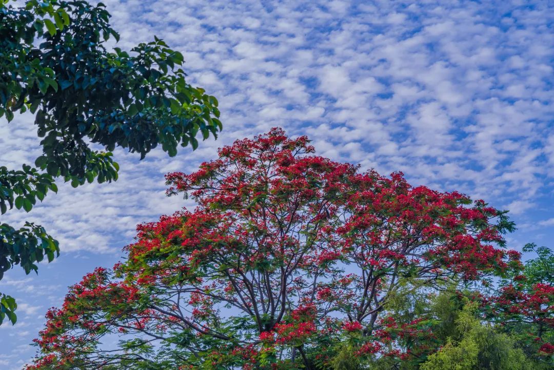 远远望去,盛放的凤凰花密密麻麻的在枝头上燃烧,在人们眼中留下这座城市的惊艳色彩。