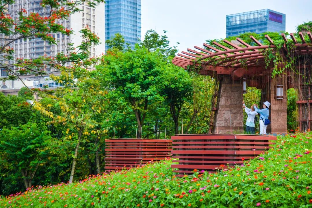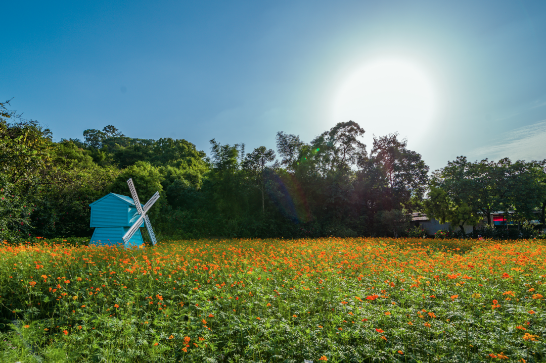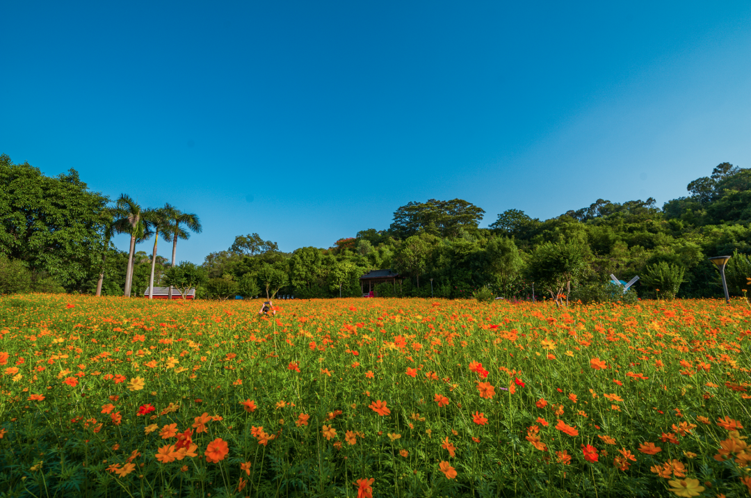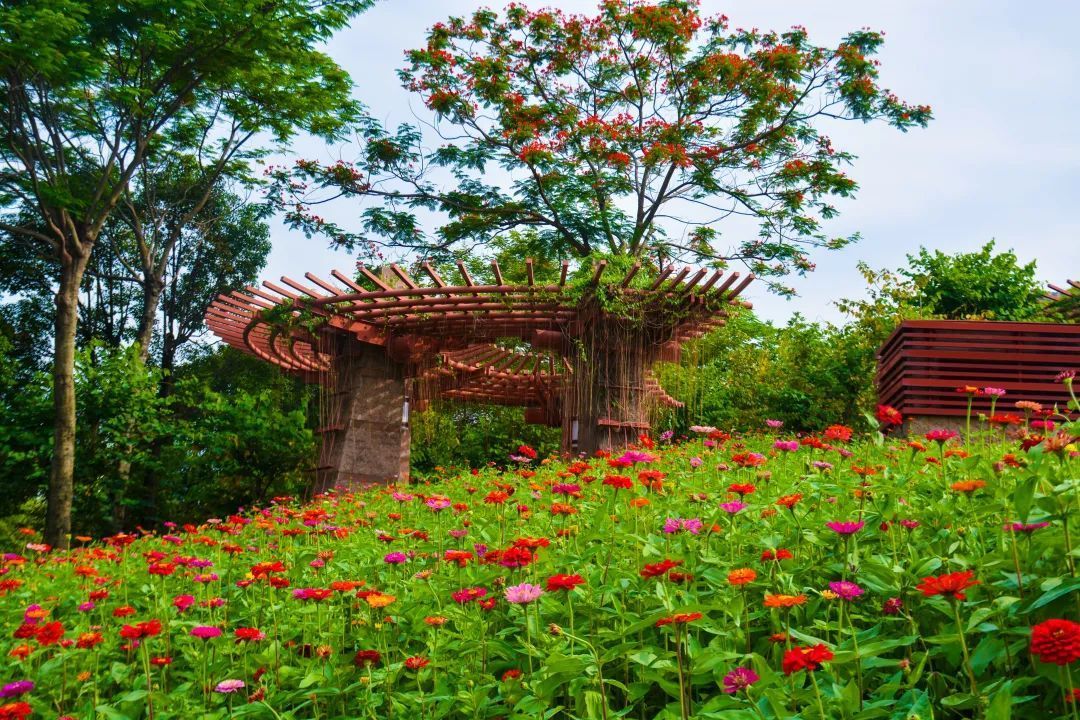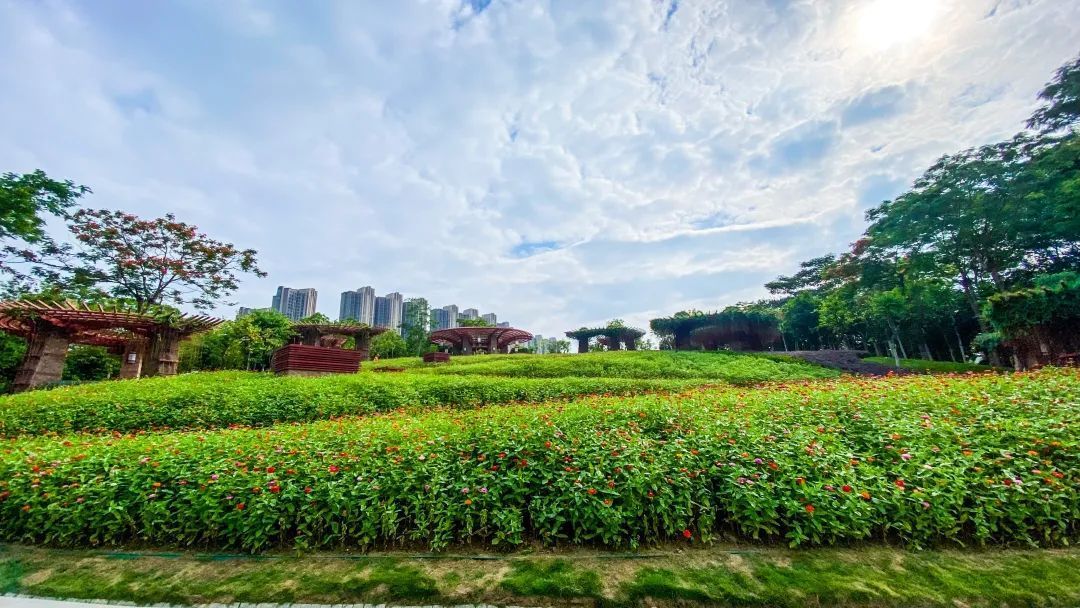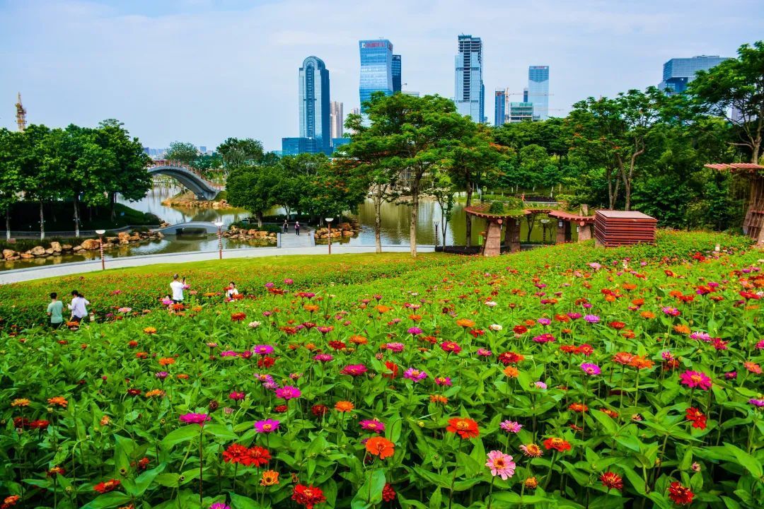 在千灯湖三期北区的梯田花海,五彩斑斓的百日草花开正艳,惹得微风怜爱轻拂。