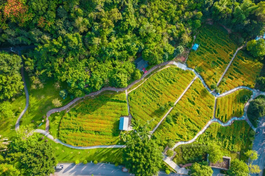 在三山森林公园山下,数千株硫华菊竞相怒放,放眼望去,入目皆是金黄,仿佛一片金色海洋。