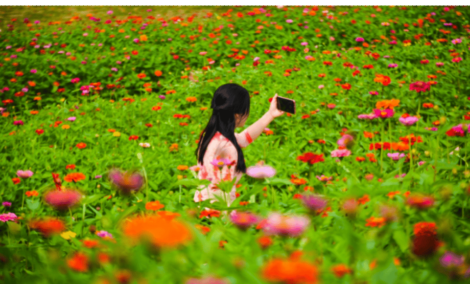 漫步在绚丽多姿的百日草花海,空气中飘散着清甜花香,让人沉醉不已。